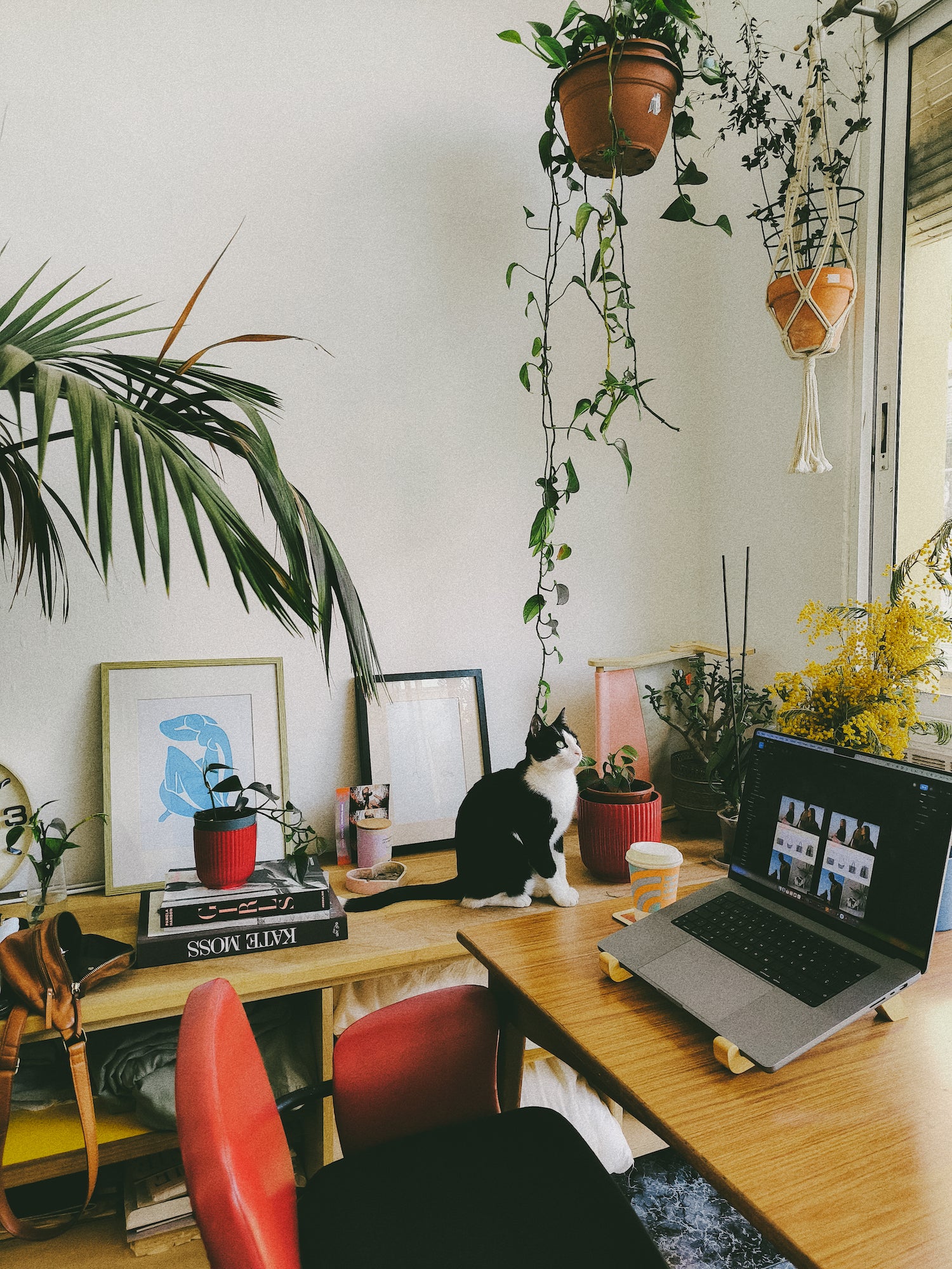 My cats, probably having art hanging on the walls to bring a nice energy into the room, cosy lighting, and lots of timber furniture, I love sourcing second hand for the home.