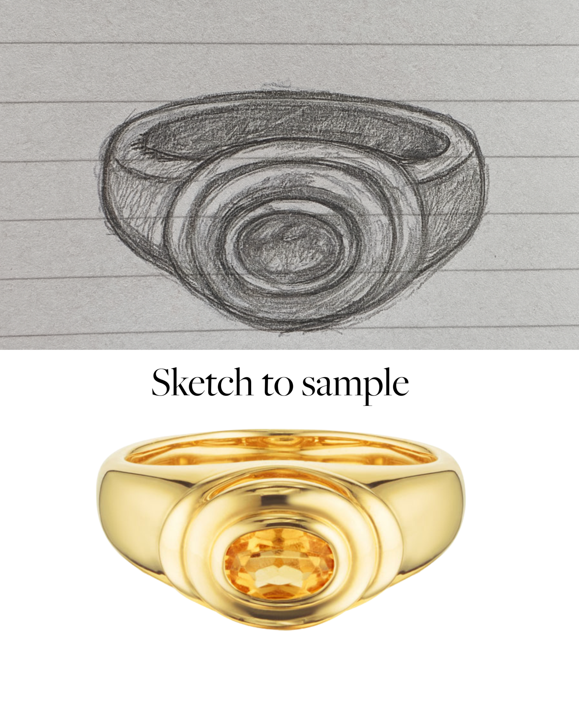 Being my best friend, I have a sense of Tattiana’s tastes, we’ve travelled the world together and I’m very familiar with her jewellery collection. In 2019 we were on Europe trip and found ourselves in old town Riga, Latvia. It was here that Tattiana found an amber beaded necklace from a local vendor and wore it for the remainder of the trip. When I was deciding what stone to pick for her ring, this memory surfaced and I realised citrine would be the perfect amber adjacent hue to use as the centrepiece of the ring.