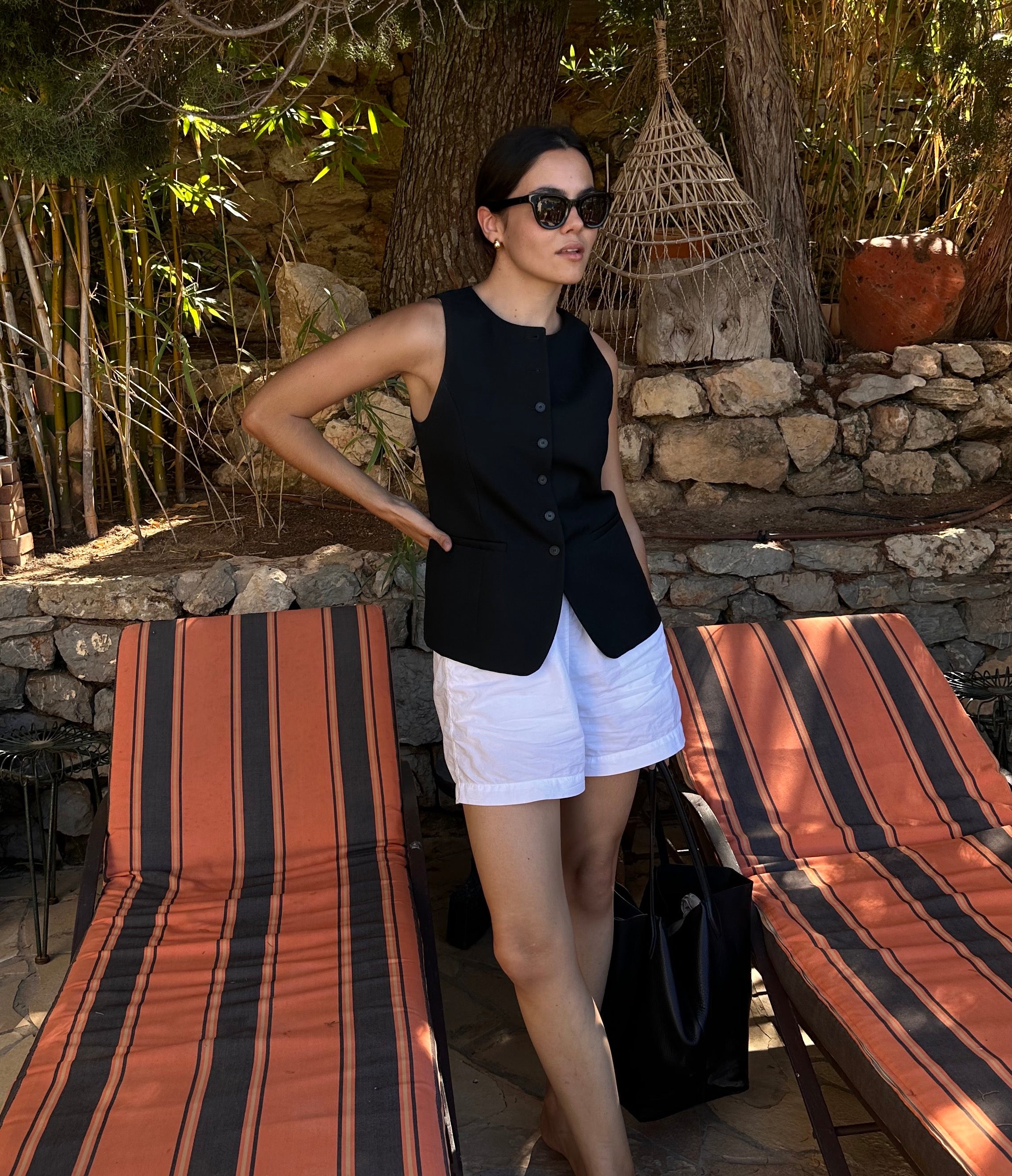 My top five wardrobe staples are a pair of long linen trousers, well-fitted jeans, a crisp white shirt, a classic tee, and either loafers or flip-flops, depending on the season. For colder months, I always reach for a timeless long coat.