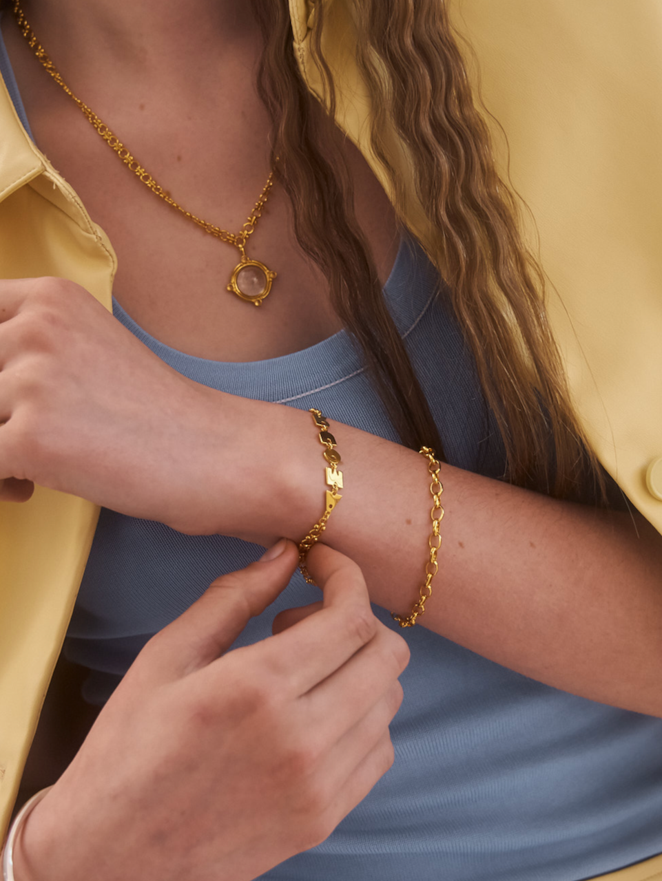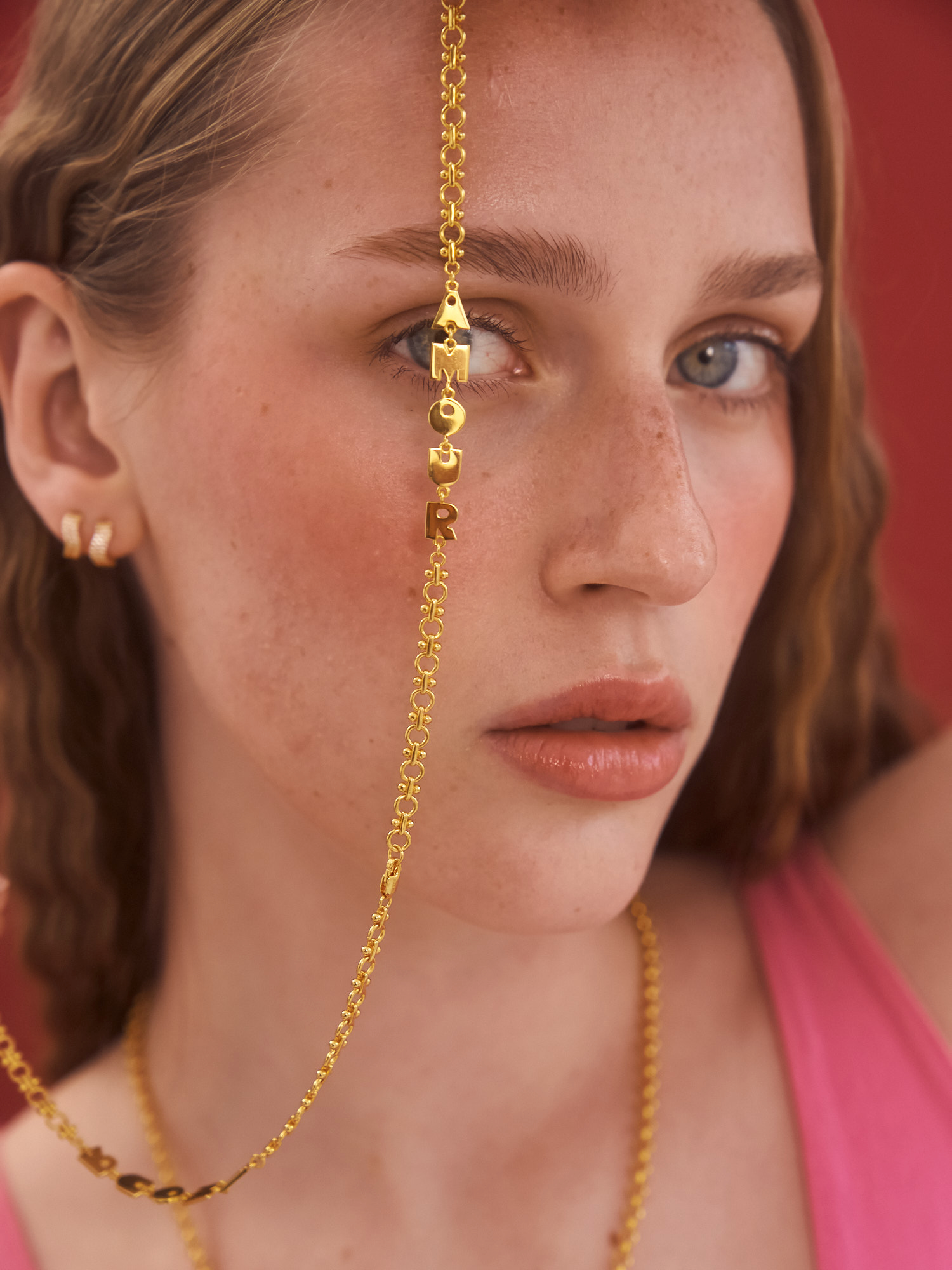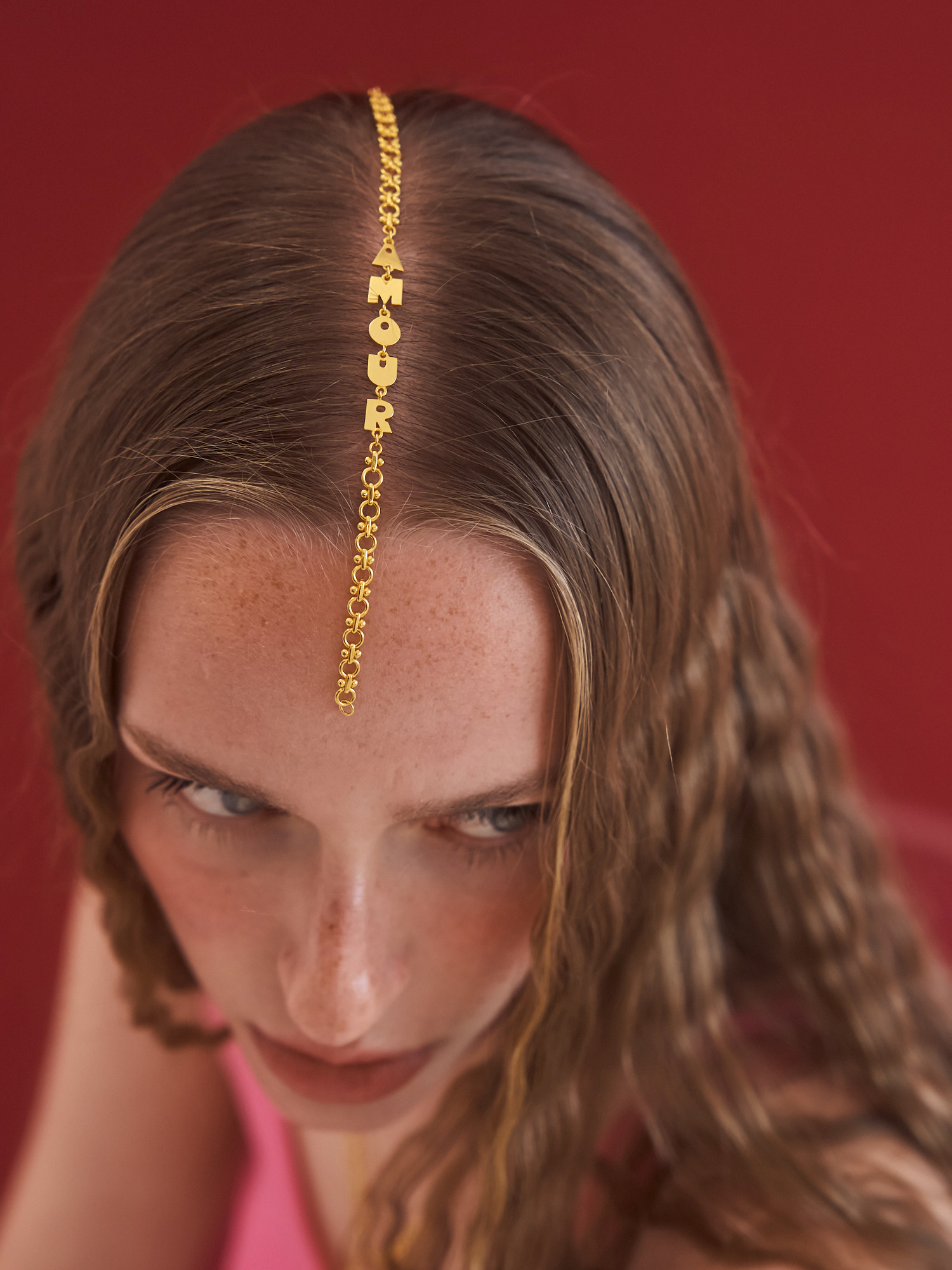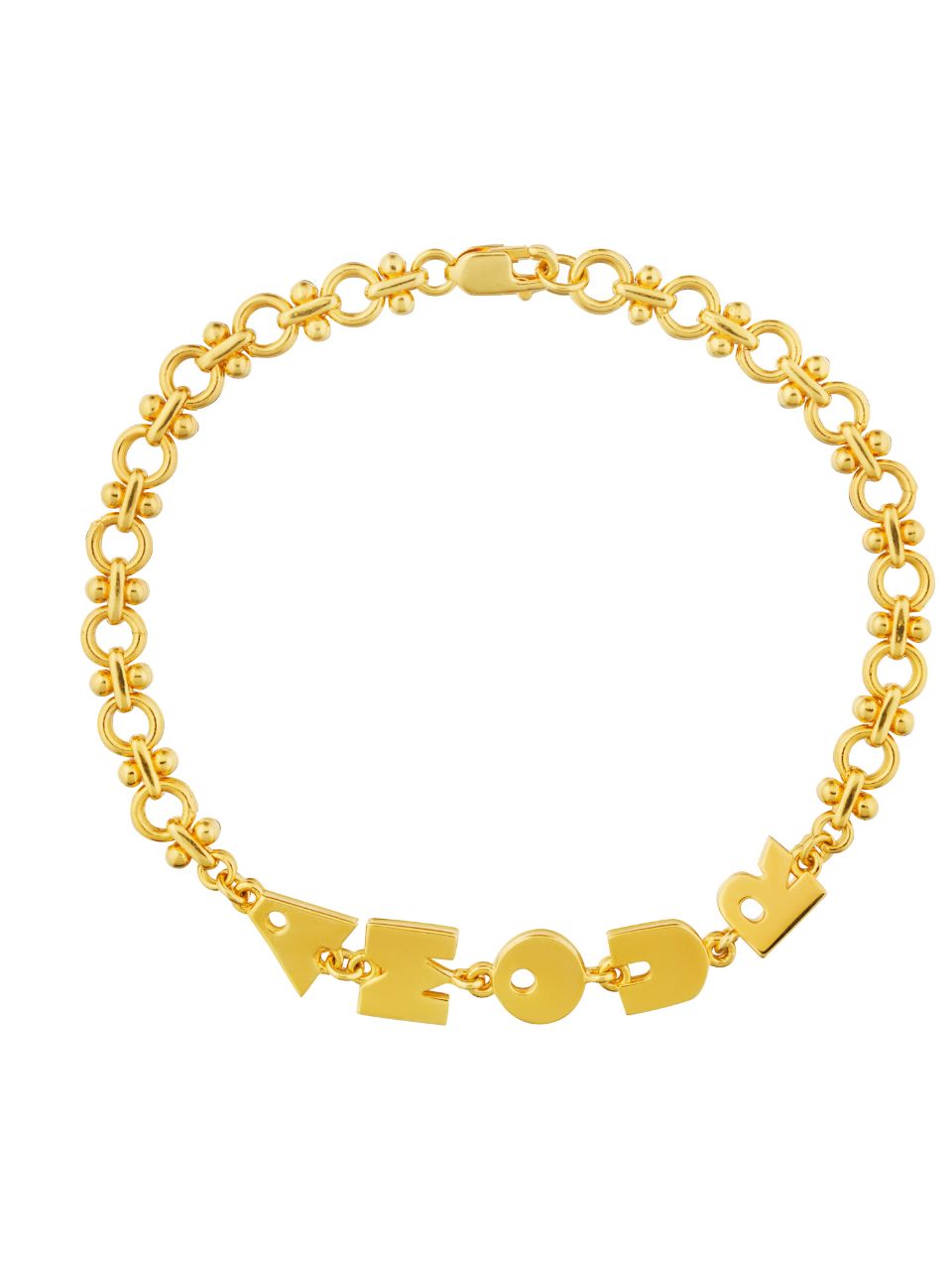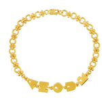 The Amour Bracelet is a charming and playful piece featuring bold, golden letter charms that spell "AMOUR" on a delicate, heirloom style chain. Its whimsical design make it a statement accessory that celebrates love with a modern twist.