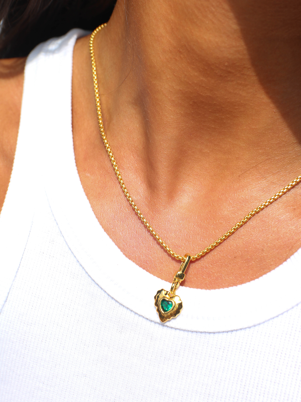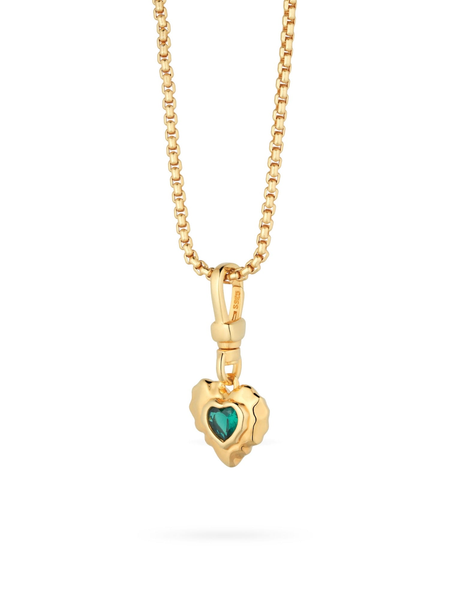 The Annasophia Necklace features an organic heart shaped pendant with an emerald coloured gem. The pendant has a clever style clip clasp so you can attach it to larger link bracelets or thread it onto just about any chain. We've added it to our popular Fernanda chain for this pairing.