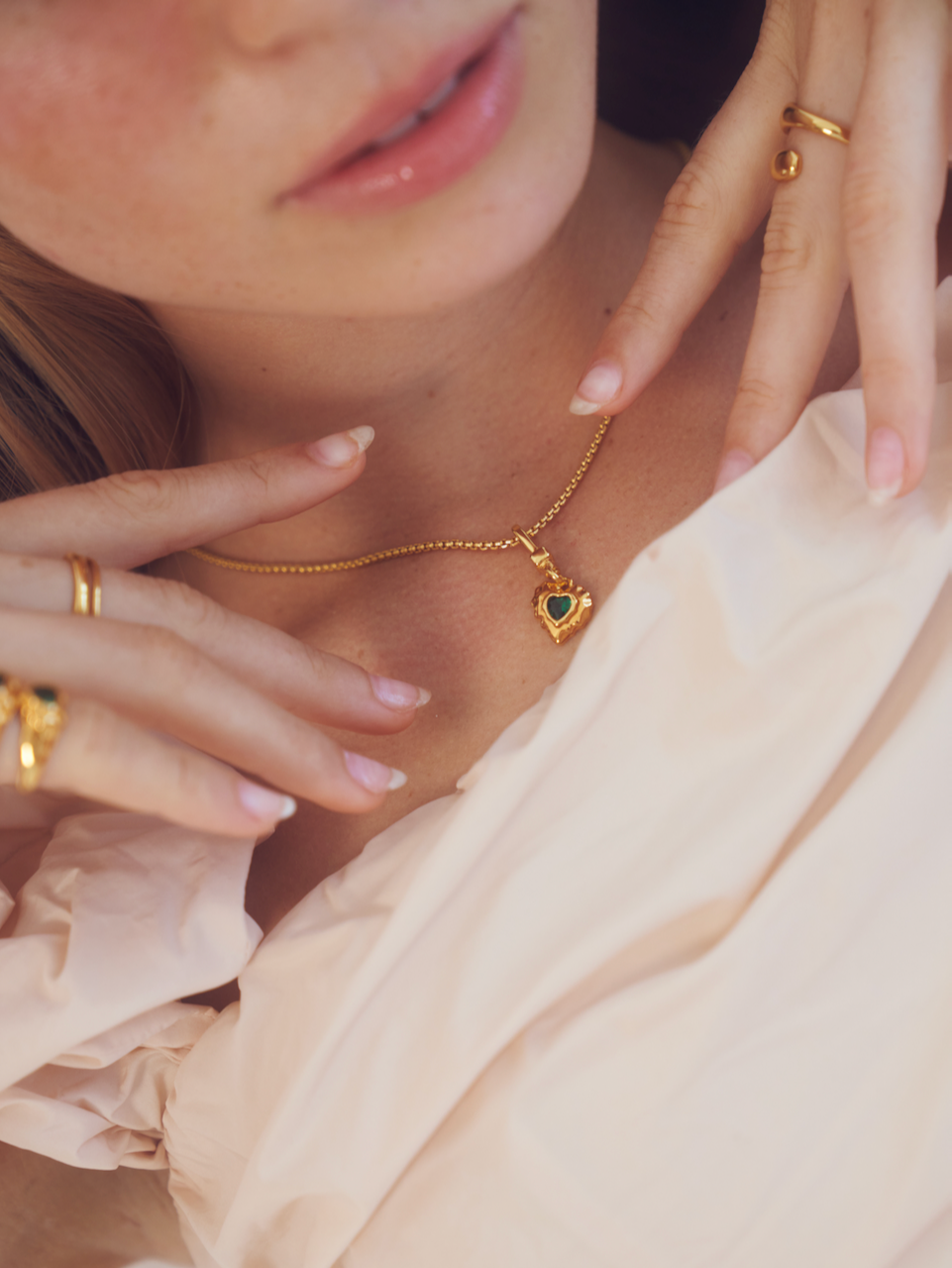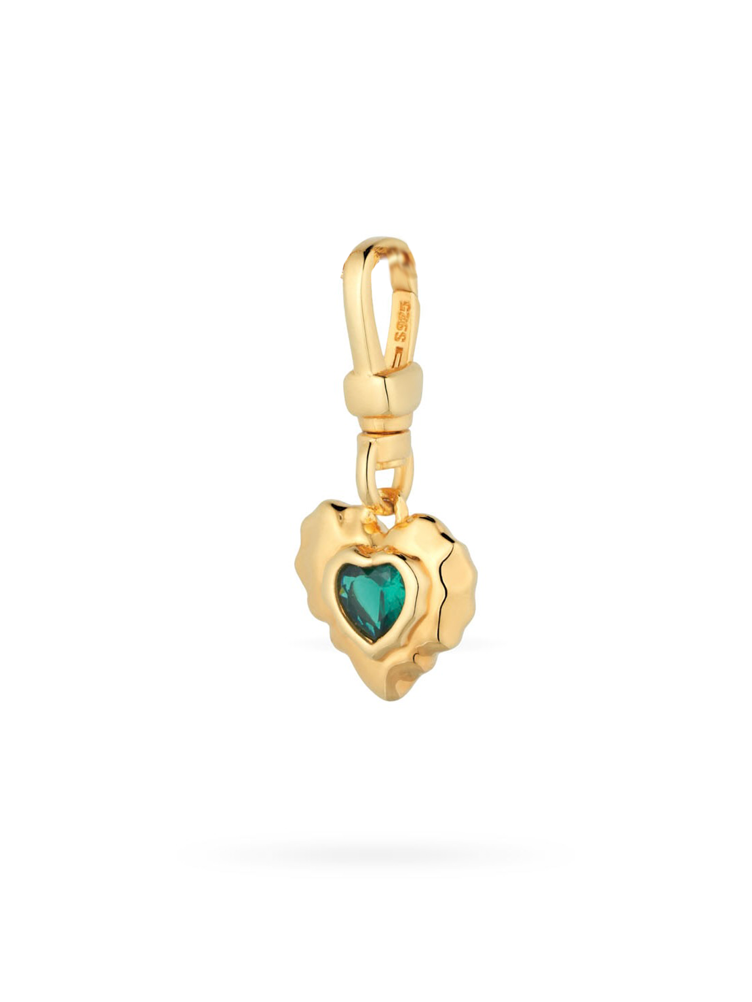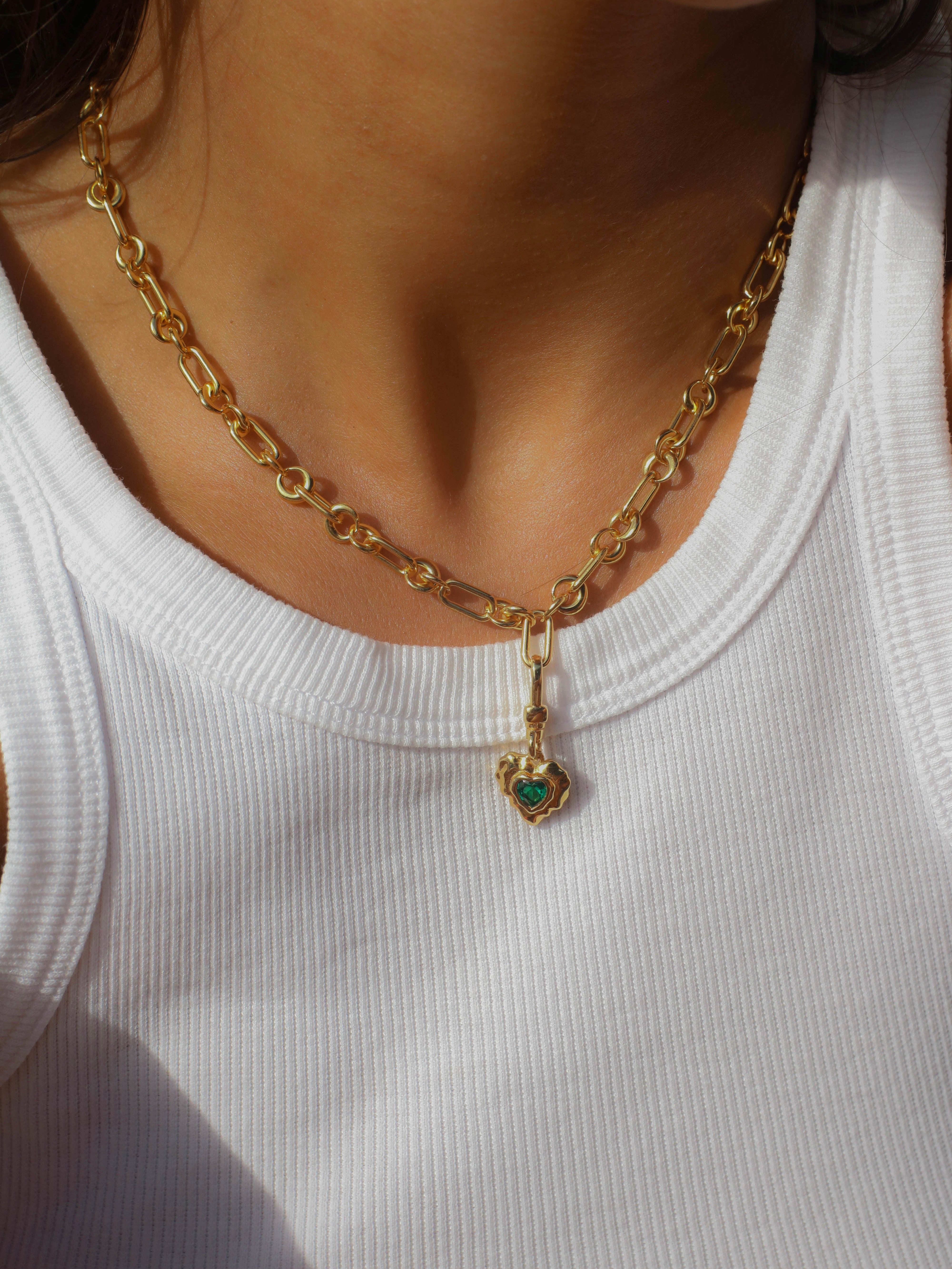 The Annasophia Necklace features an organic heart shaped pendant with an emerald gem and spring clasp. Clip onto any chain or bracelet.