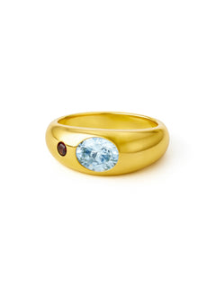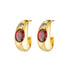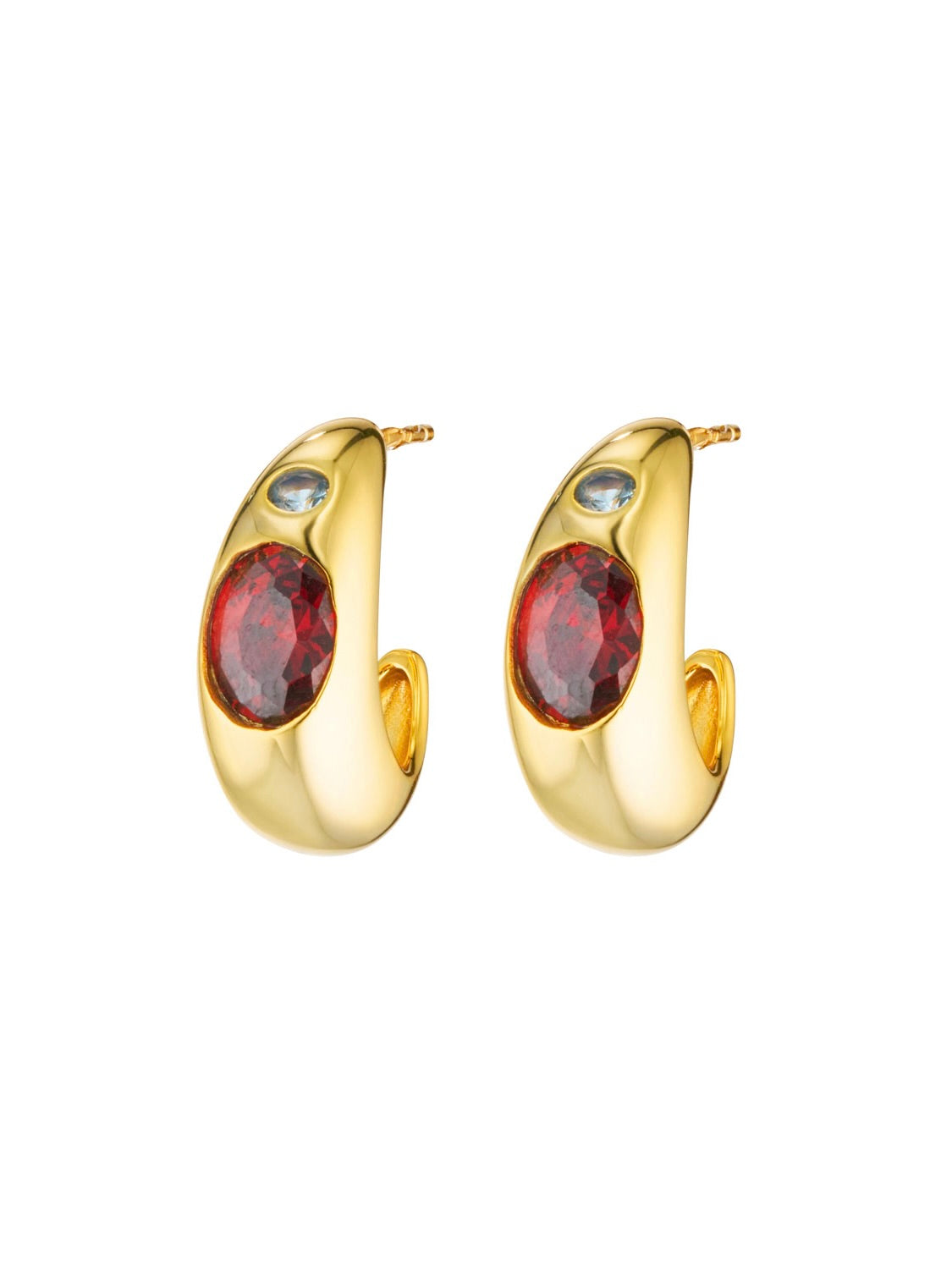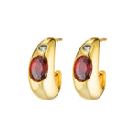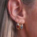 An elevated take on the classic hoop, these chunky earrings feature a large oval-cut garnet inspired stone as the centrepiece, accented by a small round-cut aquamarine coloured stone. Drawing inspiration from vintage pieces, the Bambi introduce colour, shape, and gemstone detail to a timeless silhouette, making them a bold and versatile addition to any collection.