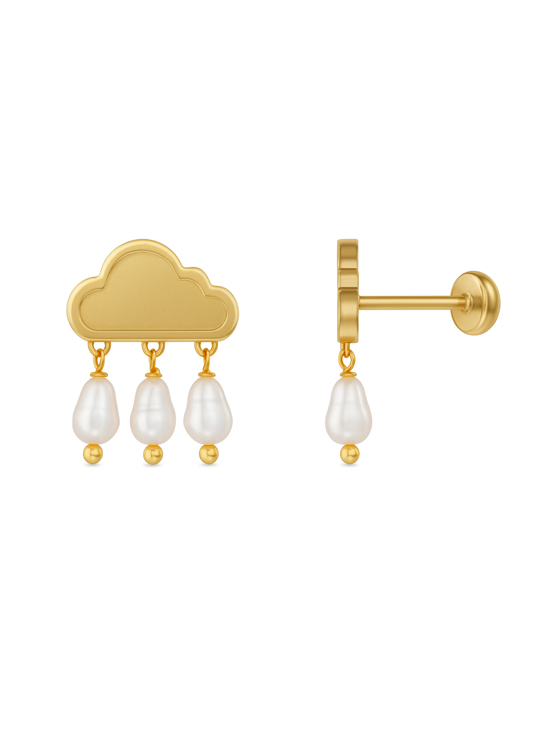 Whimsical and refined, the Cloud Stud Earrings capture a playful sense of elegance. Crafted in 18k electroplated gold on sterling silver, each earring features a softly contoured cloud motif from which three delicate freshwater pearls gently dangle like raindrops. The smooth matte finish of the gold contrasts beautifully with the organic lustre of the pearls, creating a design that feels both youthful and sophisticated. A joyful statement for everyday wear or a unique accent to evening looks.