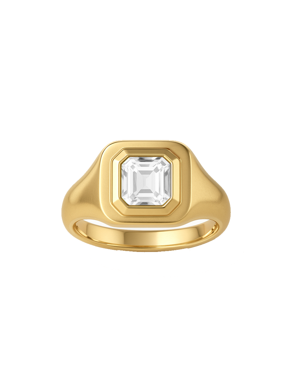 Elevate your jewellery collection with Avant Studio’s modern interpretation of the classic signet ring. Handcrafted in solid 14K yellow gold, this refined design features a striking emerald-cut lab-grown diamond, a stone revered for its exceptional clarity, brilliance, and modern allure. The sleek bezel setting and sculptural band create a bold yet timeless silhouette, designed for enduring wear and meaningful moments.