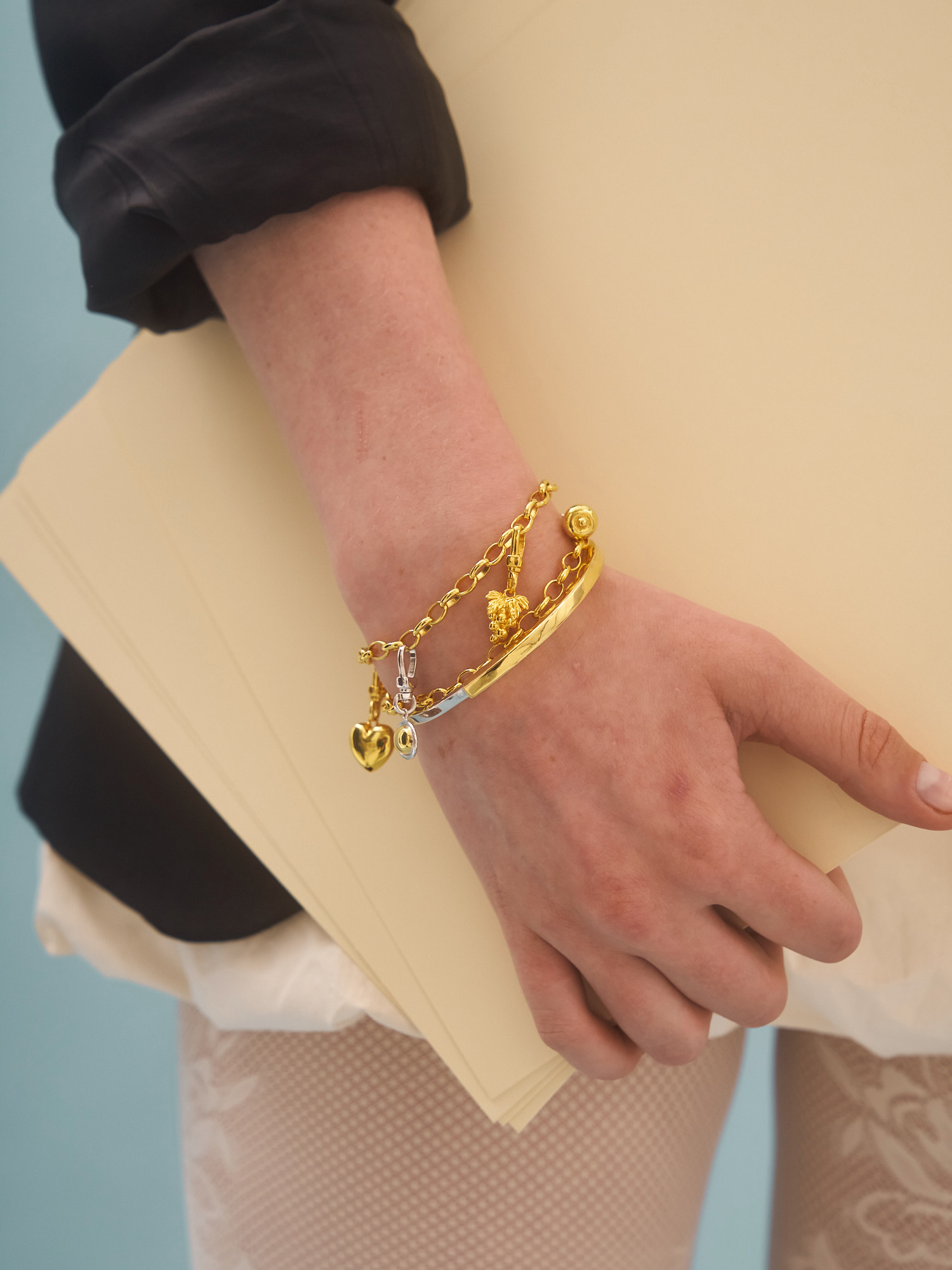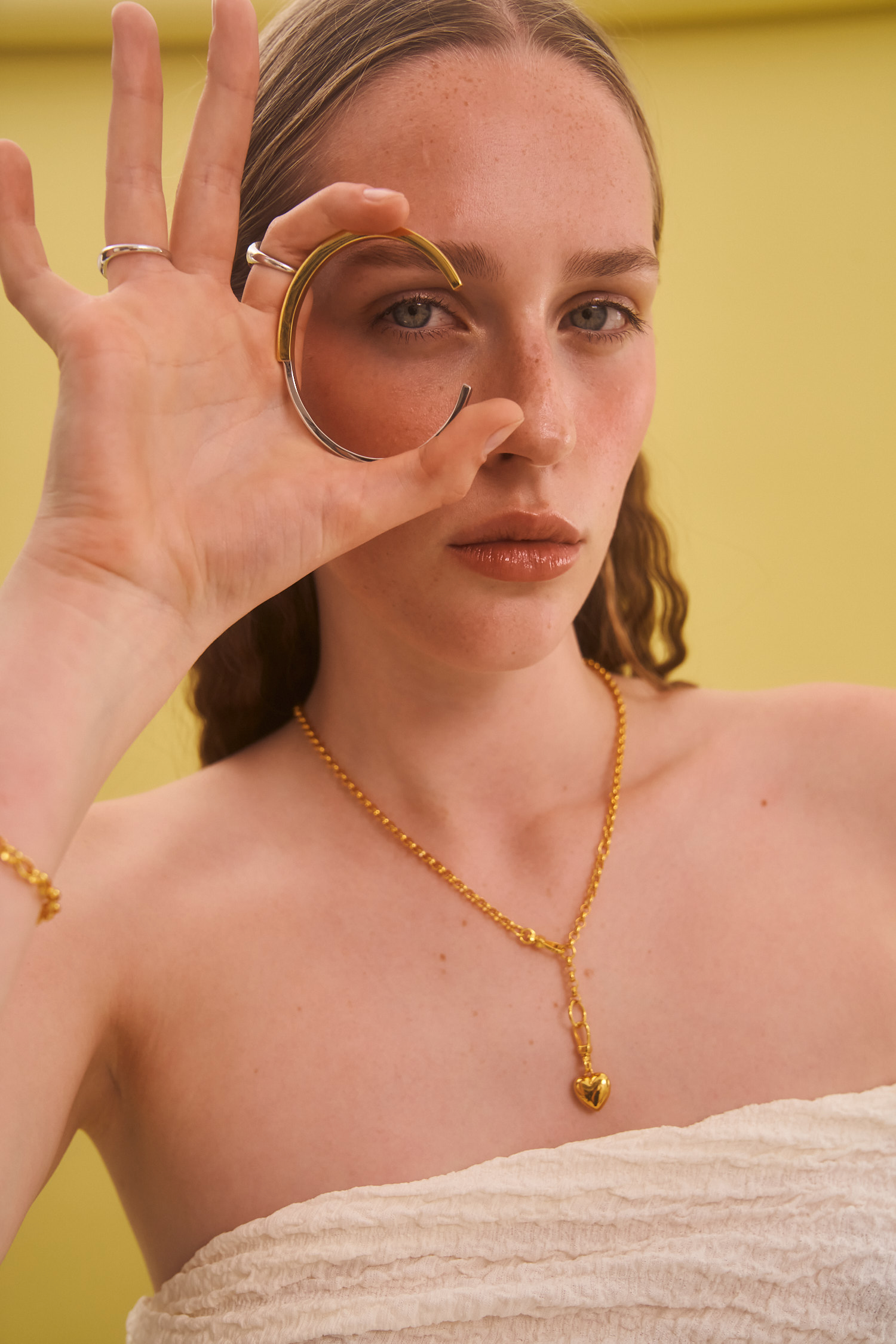The Dallas Cuff is a sleek, modern bracelet with a two-tone design, featuring polished 18k gold and sterling silver segments seamlessly connected for a minimalist, yet striking look. Its open-cuff style and clean lines make it a versatile piece that adds sophistication to any ensemble.
