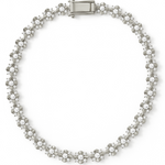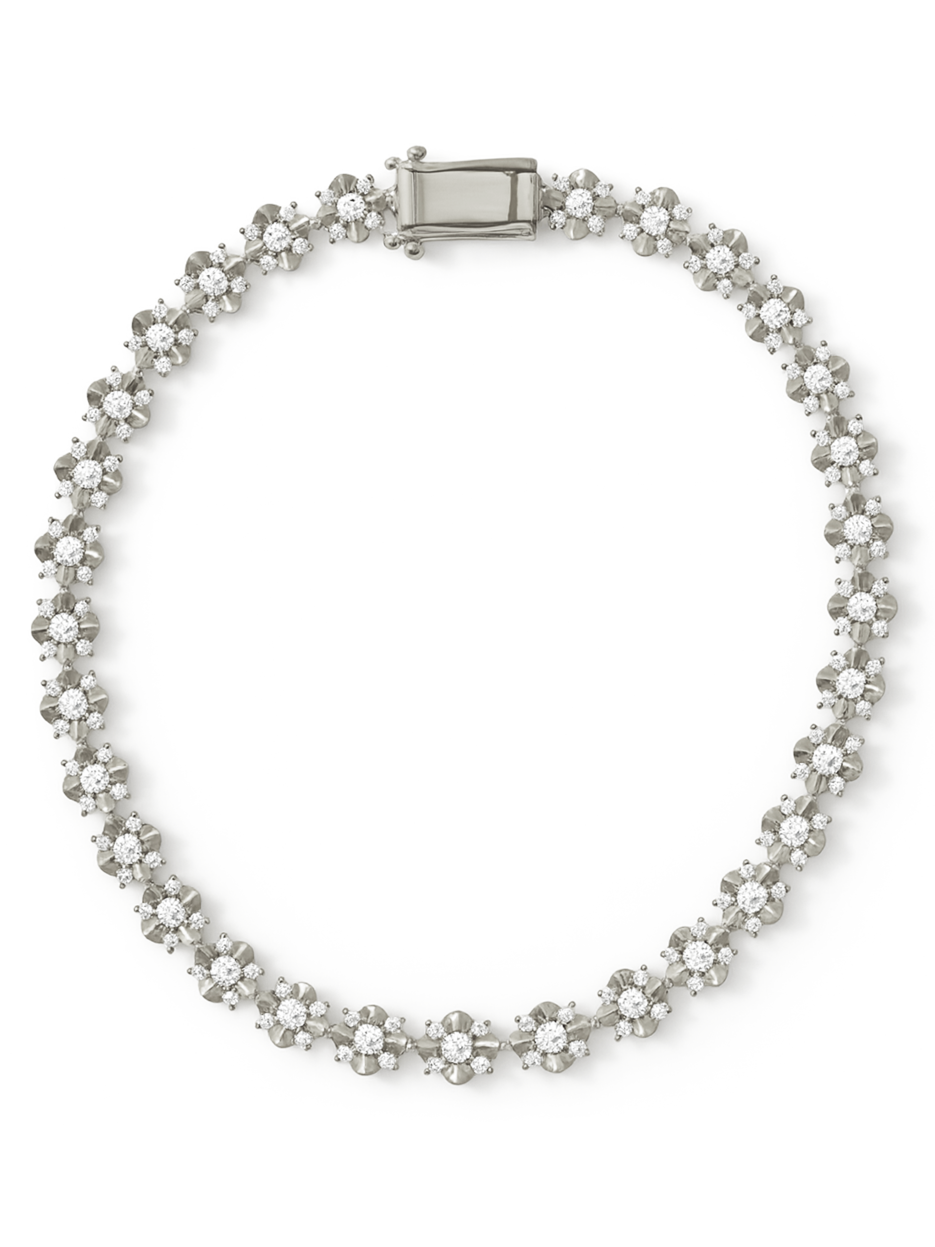 Radiant and romantic, the Flora Necklace captures the beauty of nature in timeless form. Crafted in sterling silver, this elegant piece features a continuous arrangement of brilliant-cut cubic zirconia gems, each delicately set in petal-inspired clusters that evoke blooming flowers. The intricate design balances femininity and refinement, creating a luminous statement that complements both day and evening wear. Whether worn alone or layered, the Flora adds a touch of graceful brilliance to any ensemble.
