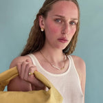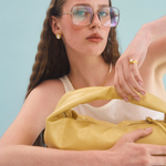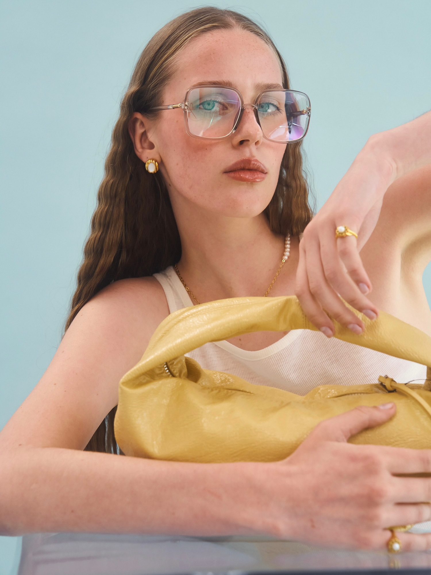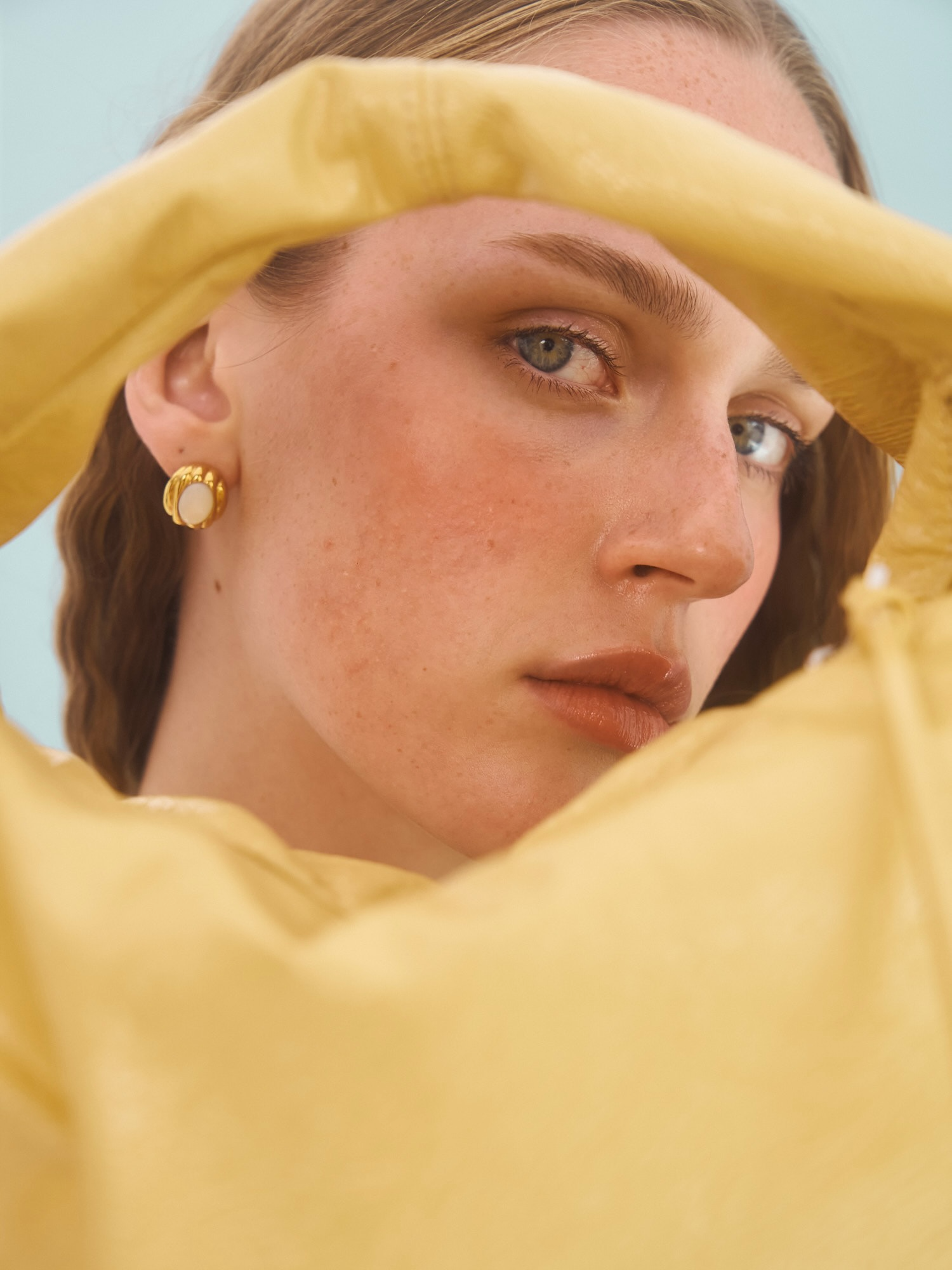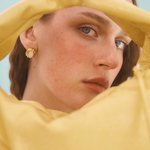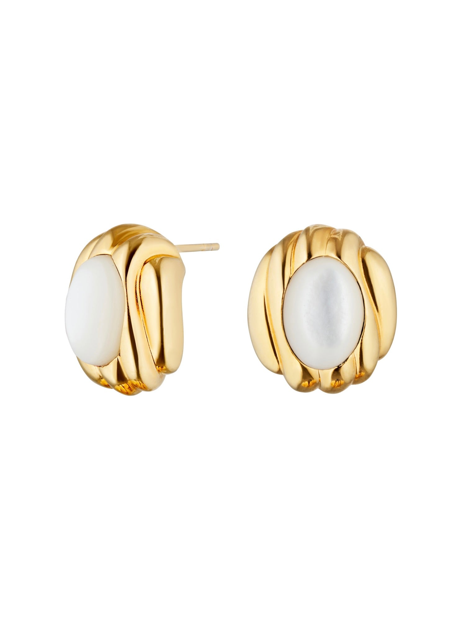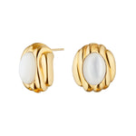 The Gia Earrings are 80s-inspired earrings that feature a bold and striking design with 18k gold plating and smooth, oval Mother of Pearl stones set in a textured, organic frame. Their retro aesthetic evokes a sense of vintage luxury and timeless elegance.
