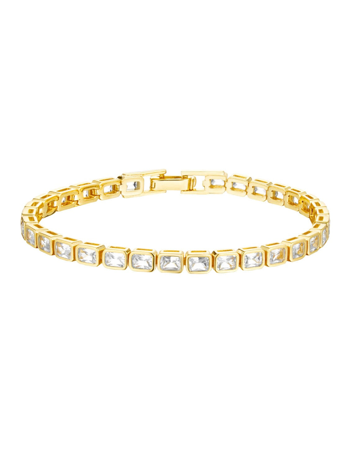 The Gidget Tennis Bracelet reimagines a classic design with contemporary sophistication. Crafted in 18k electroplated gold on 925 Sterling Silver, this refined piece features a seamless row of baguette-cut cubic zirconia. Each set in sleek geometric bezels for a modern, architectural edge. The bracelet’s fluid construction ensures a comfortable fit, while its radiant finish catches the light from every angle. Perfect on its own or layered with other pieces, the Gidget adds an effortless touch of glamour to any look.