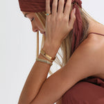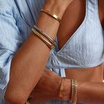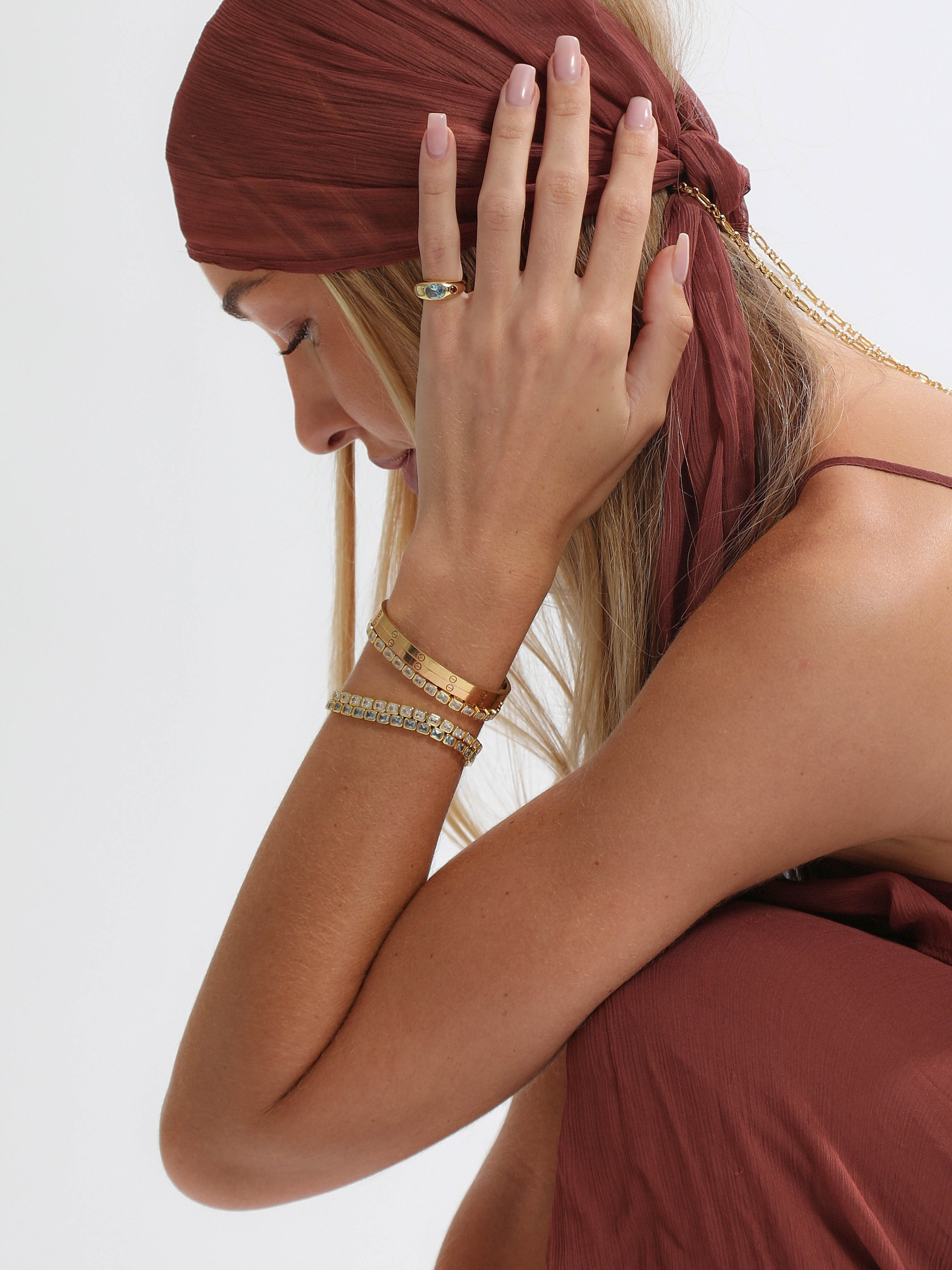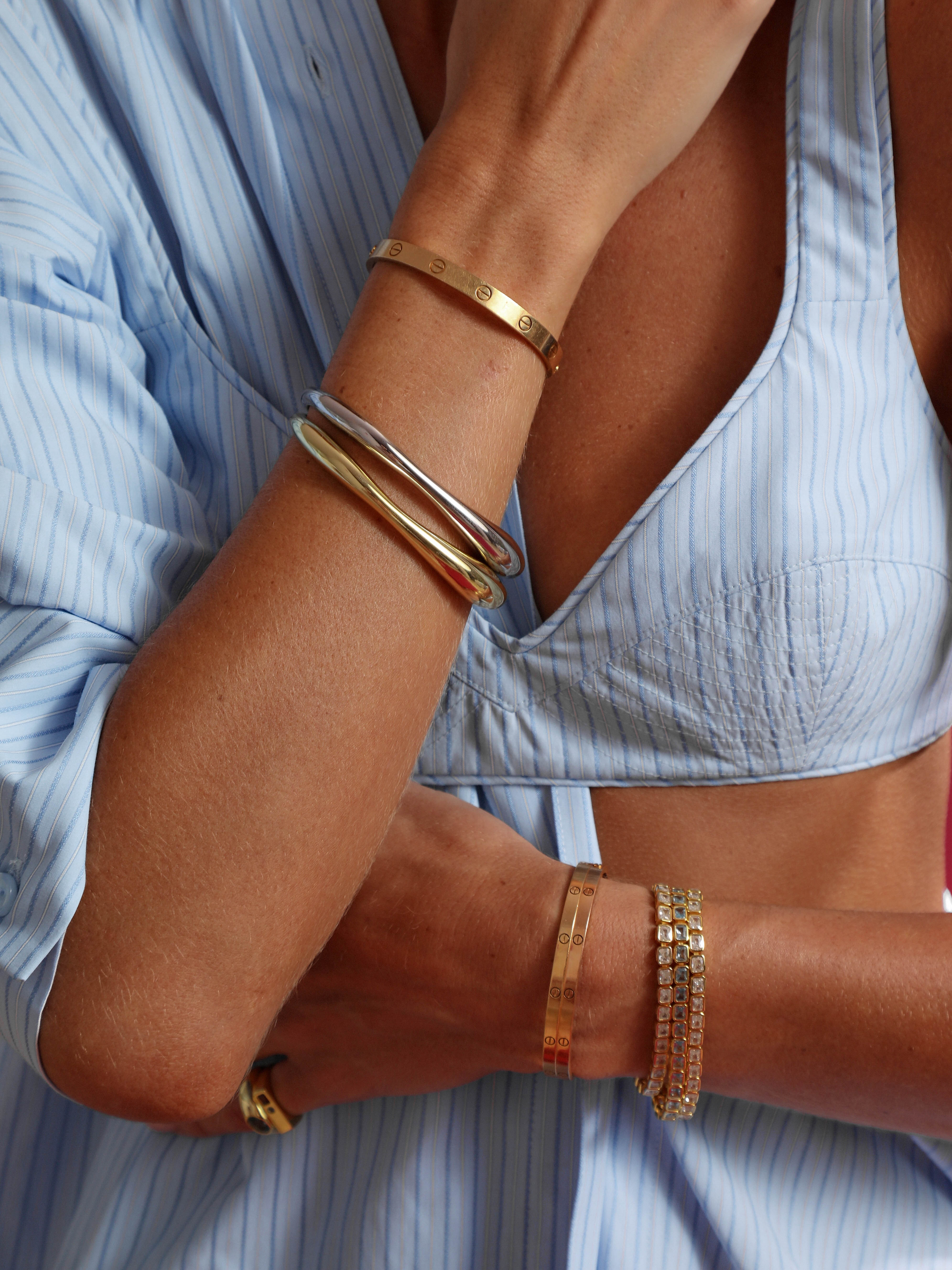 A modern twist on a classic design, this The Gidget tennis bracelet is set with emerald-cut, bezel-set aquamarine stones for a fresh, vibrant touch. Sleek and versatile, it’s perfect as a standout piece on its own or layered with other bracelets for a curated look. Lightweight and refined, it adds effortless elegance to any outfit.