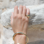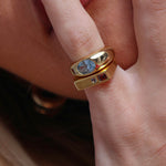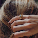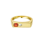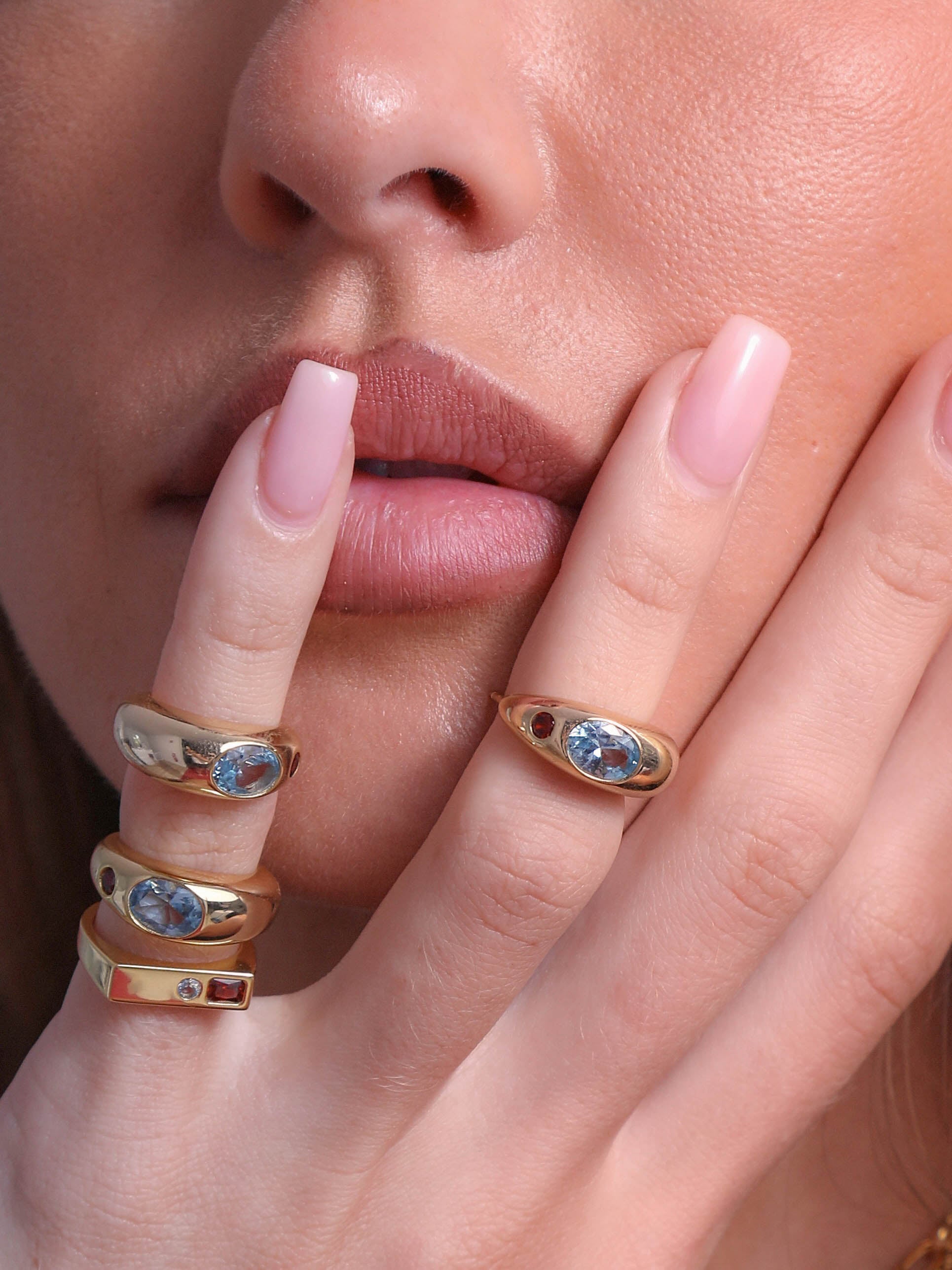 The Sammy x Avant Studio Jessica Ring is named after Sammy's sister, Jess. Featuring a sleek, flat rectangular signet face, the ring is set with an emerald-cut dark garnet and a round-cut aquamarine side by side. The contrasting shapes and colours create a bold, eye-catching look. A striking combination of shapes and stones inspired by precious gems for a standout piece.