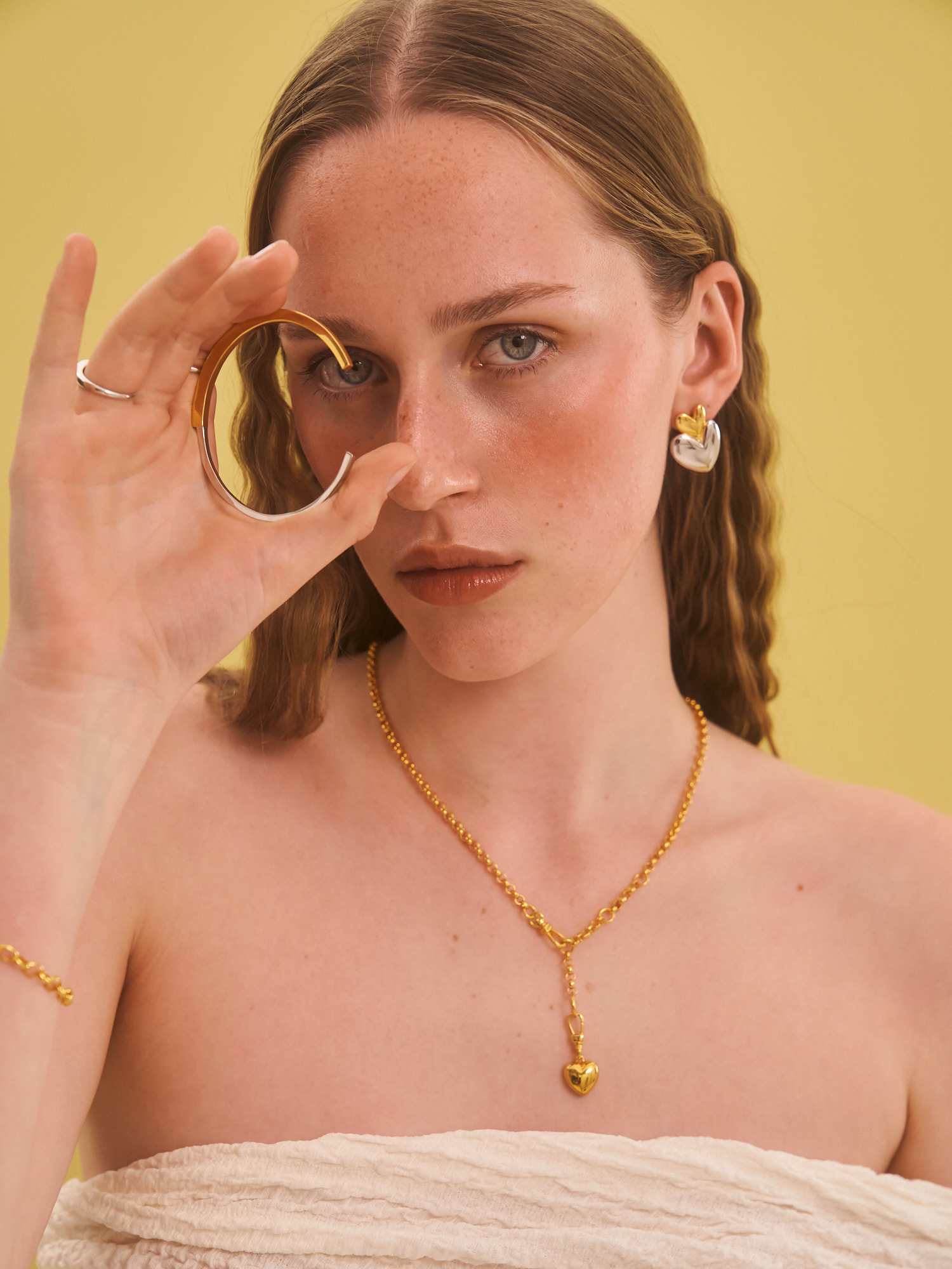 The Vivienne Earrings feature a striking two-tone design, combining polished gold and silver hearts for a bold yet romantic statement. Their layered look and contrasting metals evoke a vintage charm, making them a playful addition to any outfit.