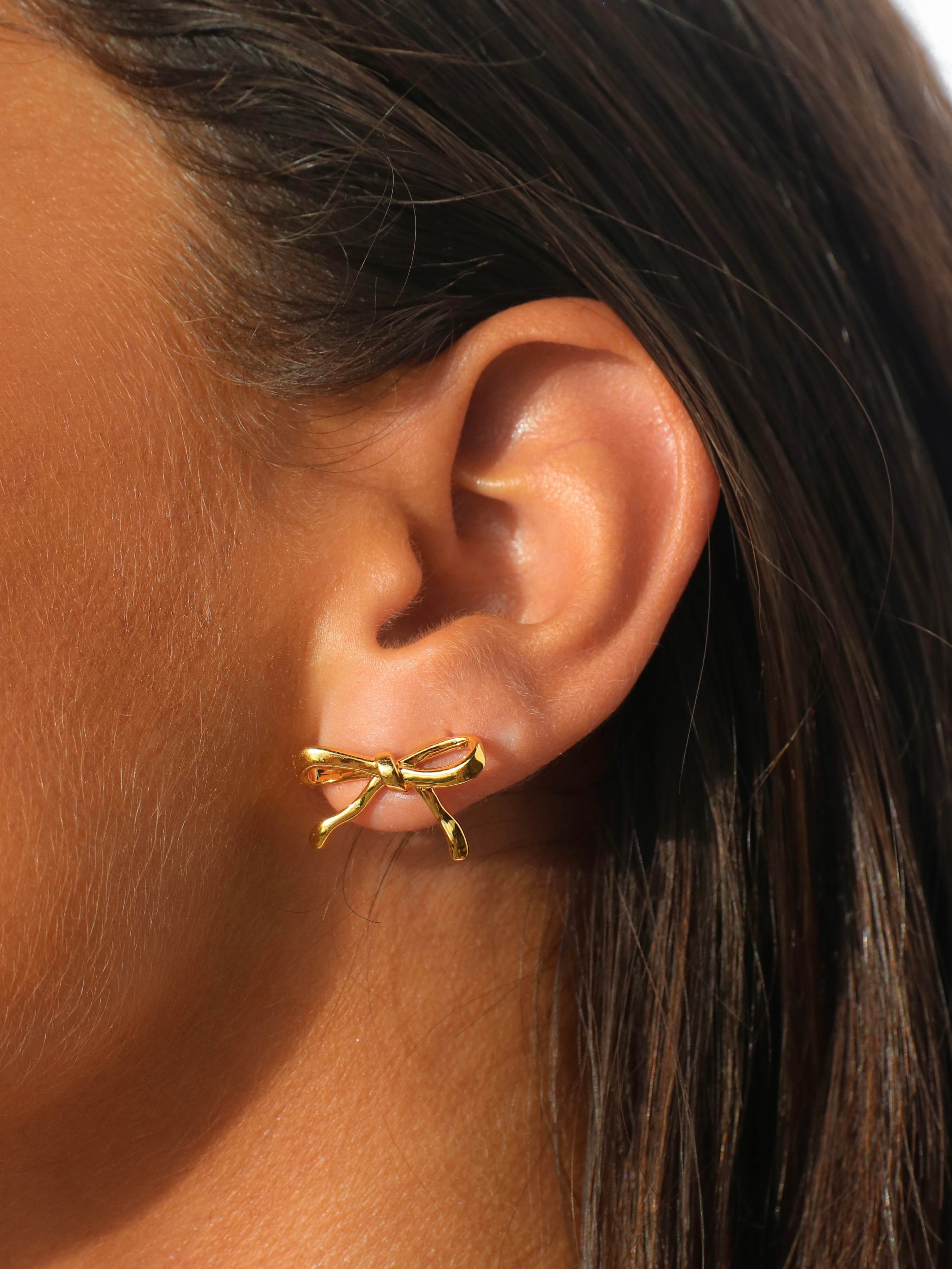 Our Lulu bow earrings will elevate your ear game. Little bows to adorn your ears for day or evening wear. Cute ribbon shaped stud earrings.