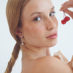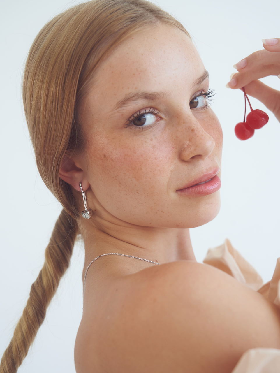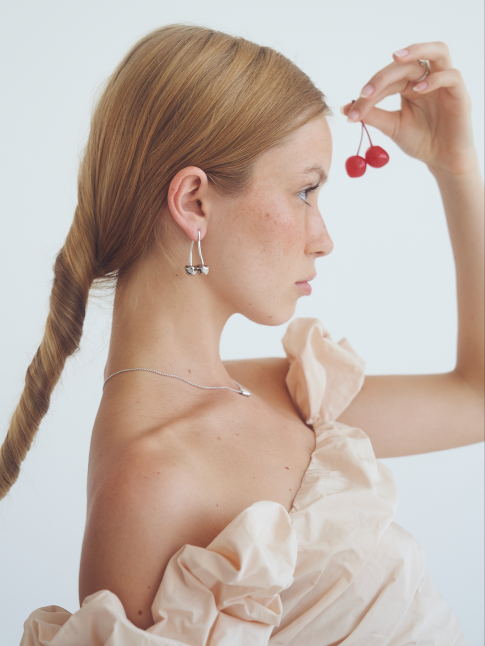 Silver cherry earrings, the Penelope are playful and versatile. With two weighted cherry stalks, wear as a double or single cherry on each ear.