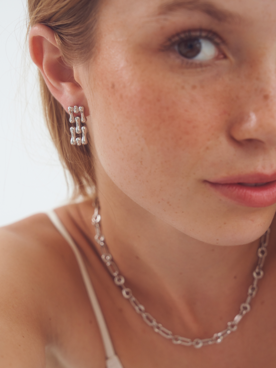 The Persephone Earrings Silver are named after the goddess of Spring. These 'chain' design earrings are also inspired by the bold jewellery of the 1980's.