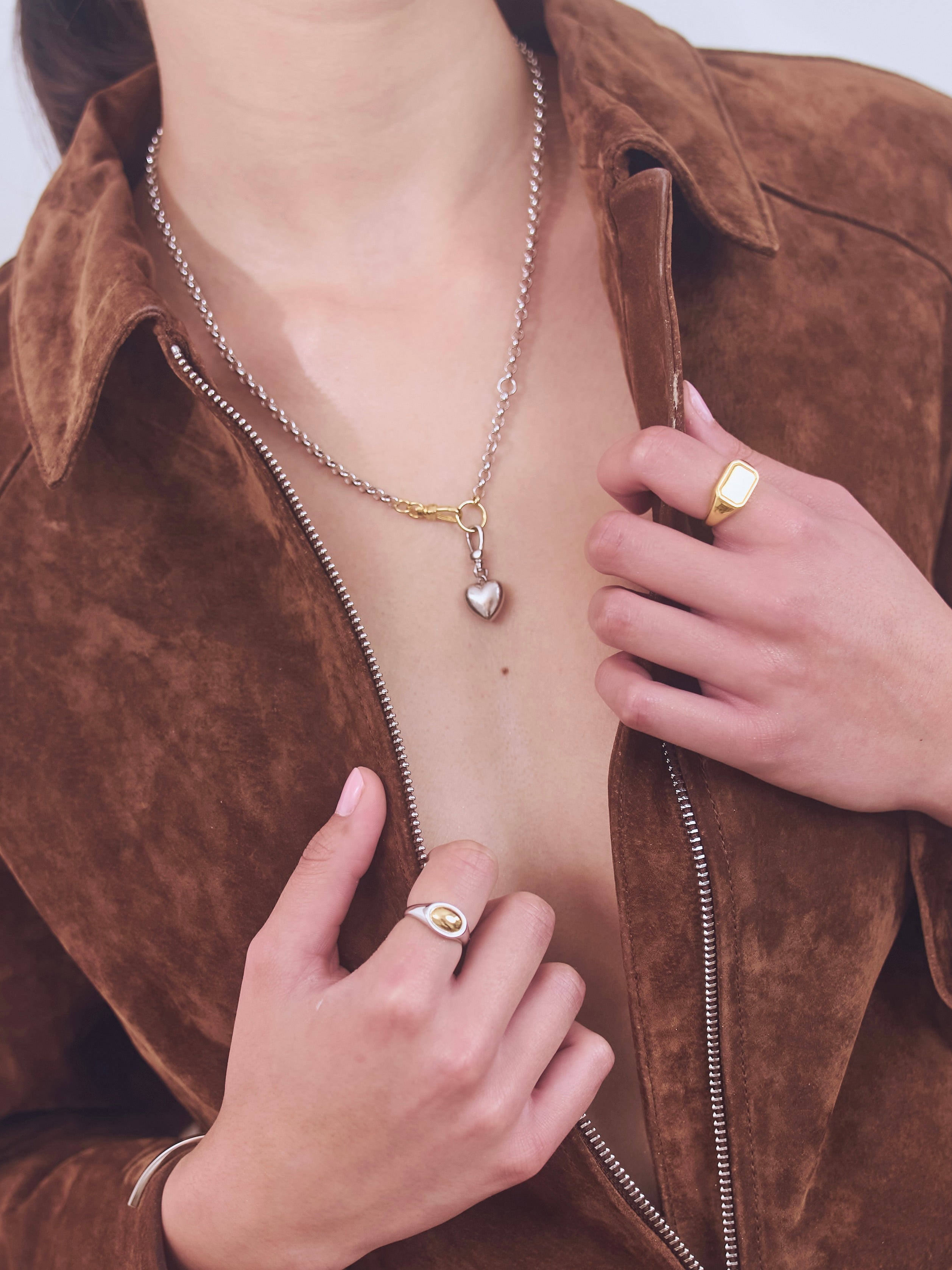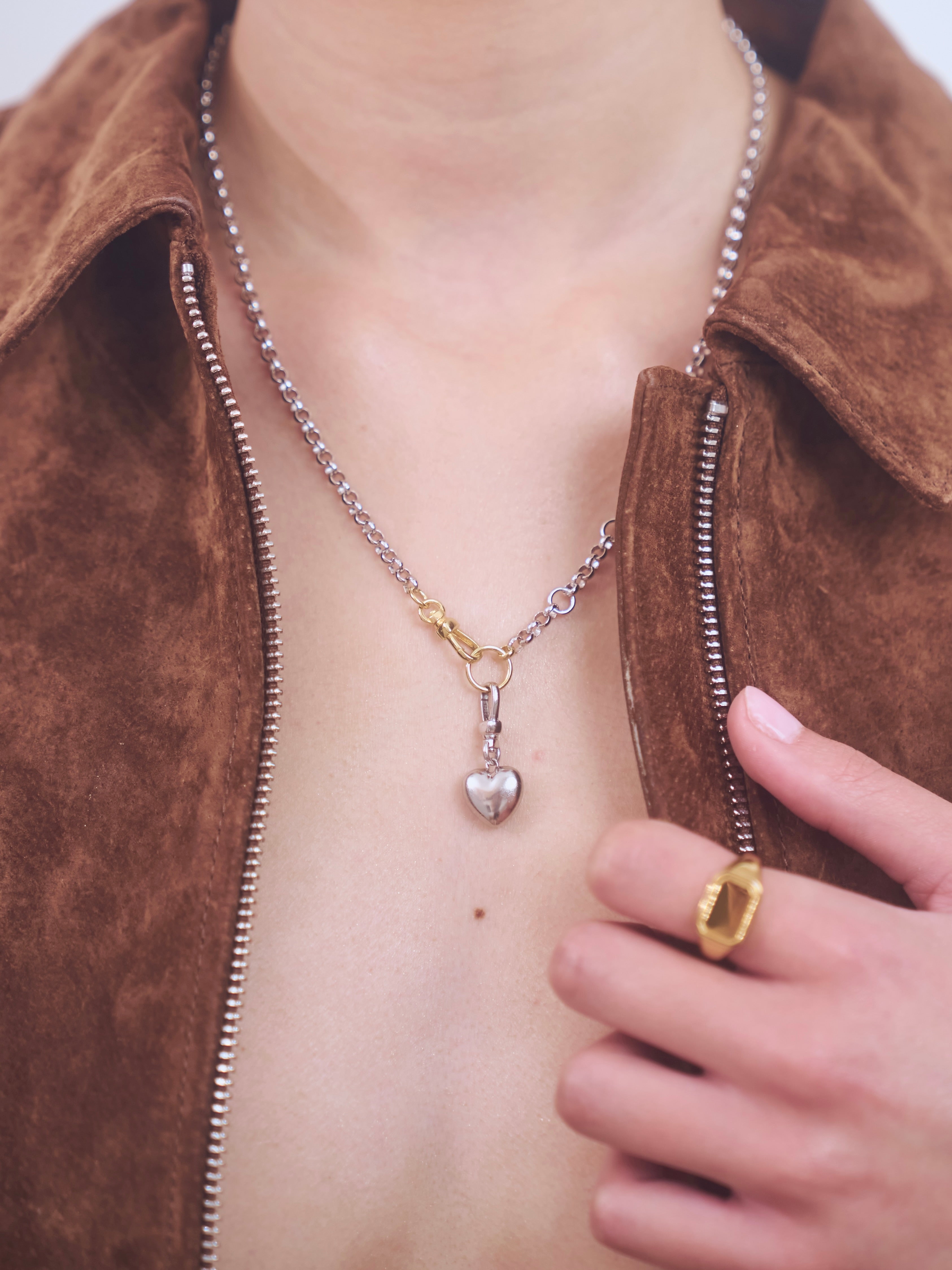 Crafted in Sterling Silver, the Puff Heart Necklace captures bold femininity and nostalgic charm in perfect balance. The chunky belcher chain leads to a statement heart pendant—voluminous, polished, and full of warmth. Designed to be worn solo or layered, its swivel clasp detail adds an edge that sets it apart from traditional silhouettes.