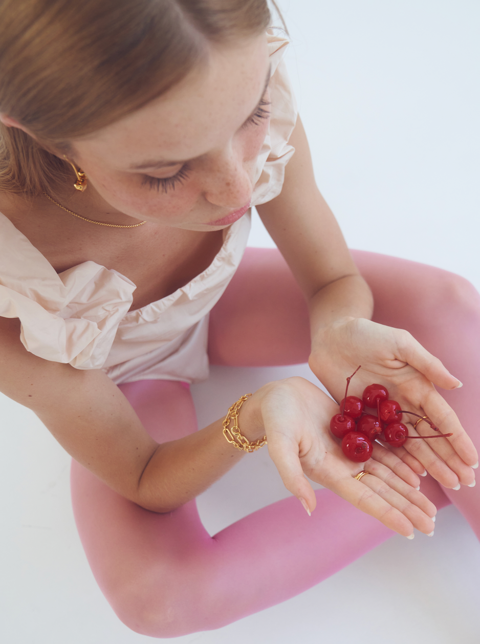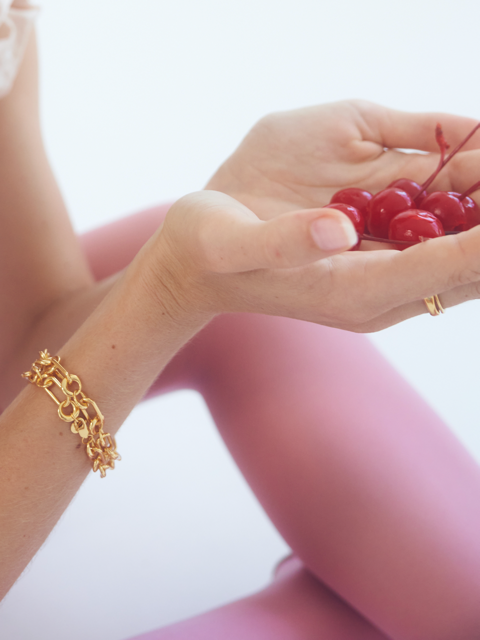 The Serafina Bracelet Gold is a larger link and ring style chain, perfect for layering or wearing on its own.
