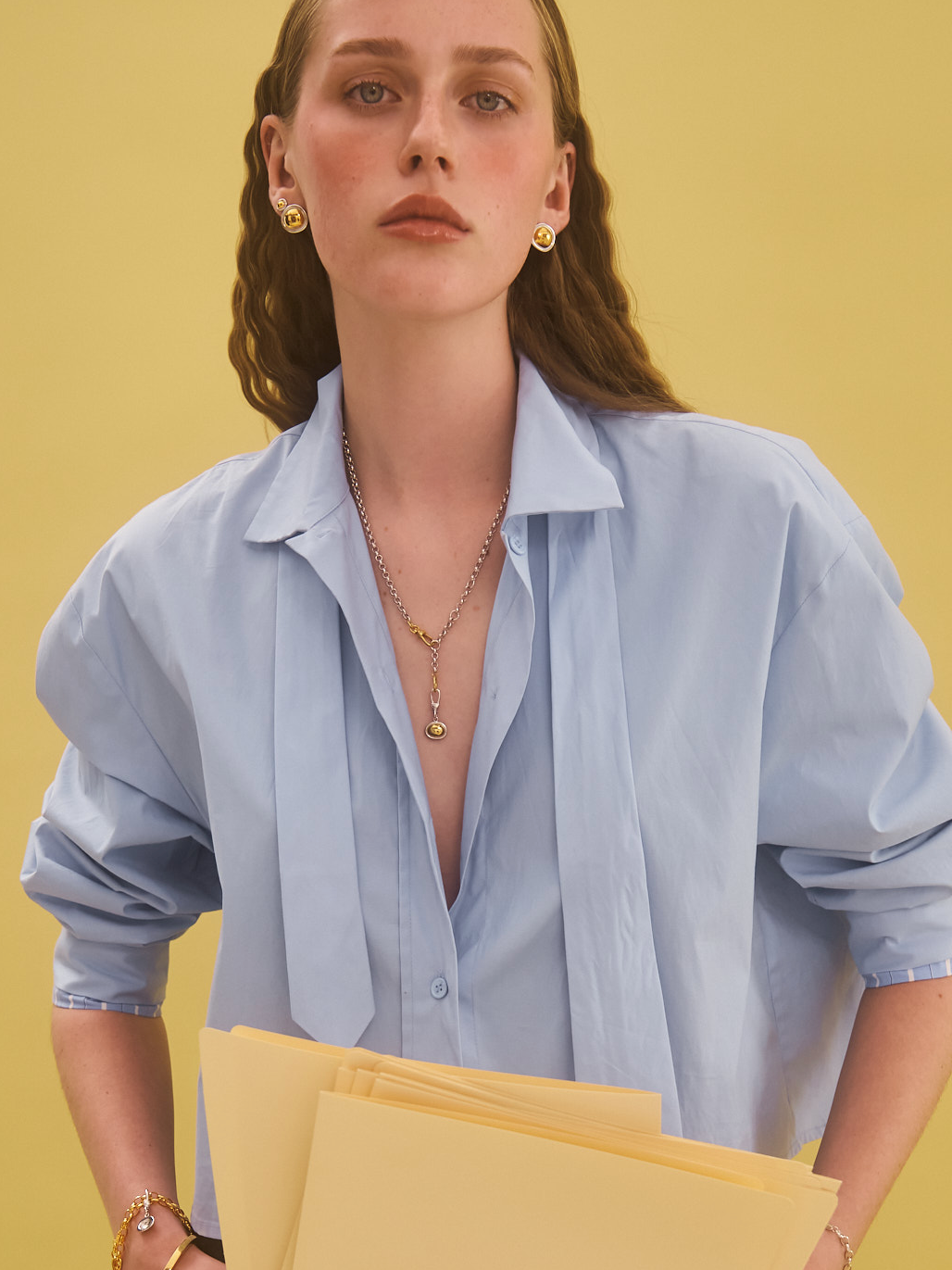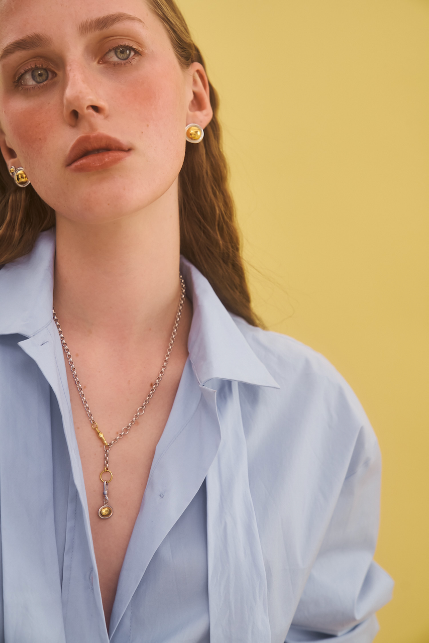 The Ouvo pendant is a bold and contemporary piece that features a smooth, egg-shaped centrepiece in polished 18k gold plating. Its minimalist design and organic shape create an understated elegance, making it a versatile addition to any jewellery collection.