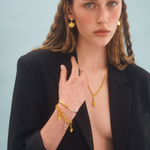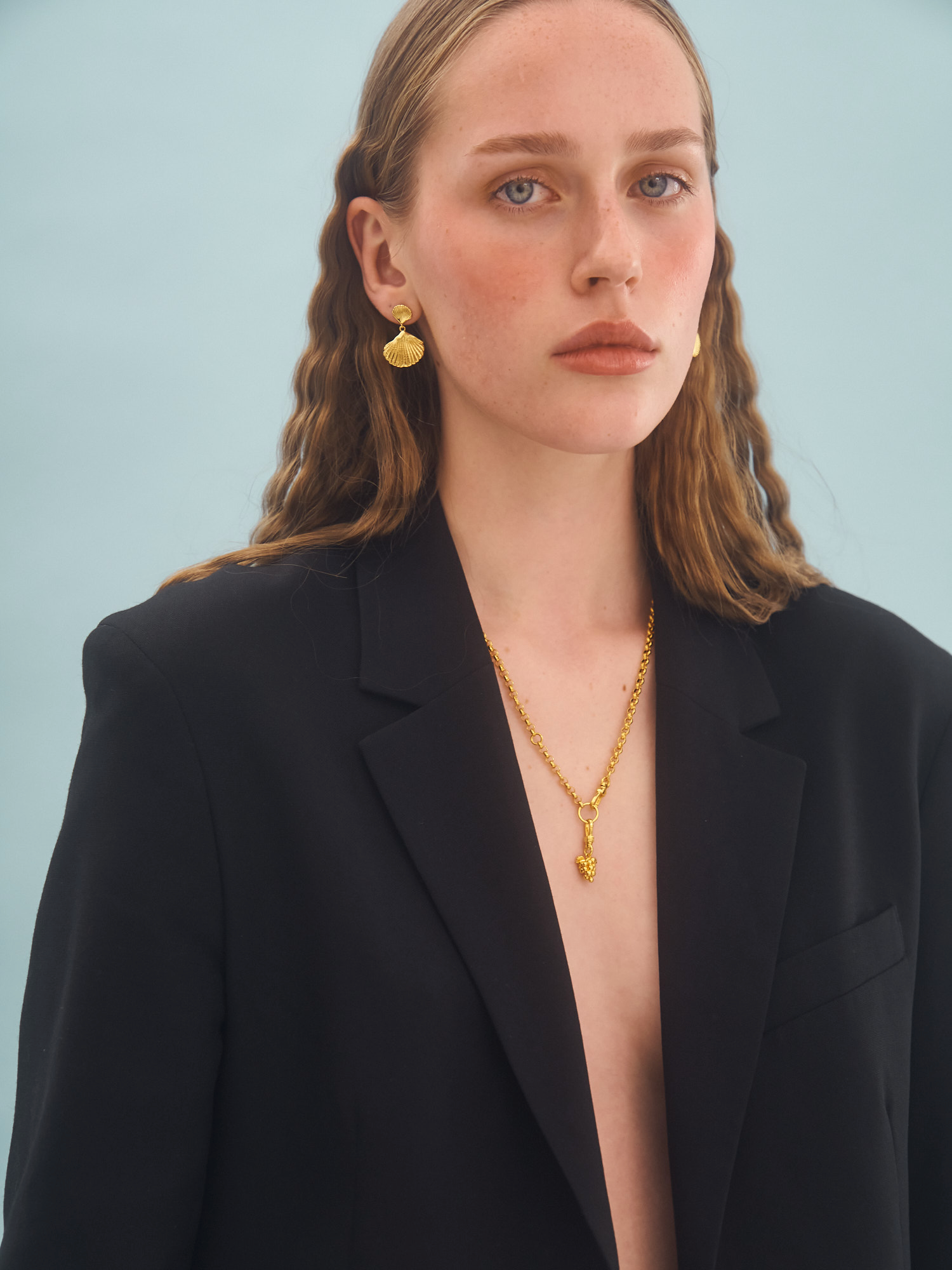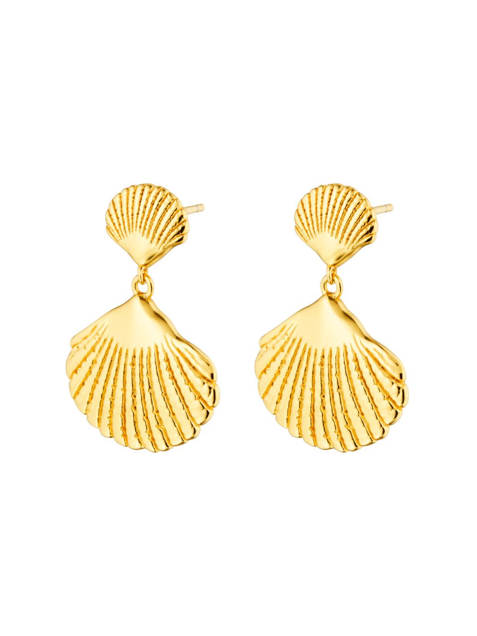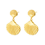 The Ursula Earrings are elegant, ocean-inspired accessories featuring a double-shell design in lustrous 18k gold plating. Their unique shape captures a seaside essence, blending sophistication with a playful, nautical charm.