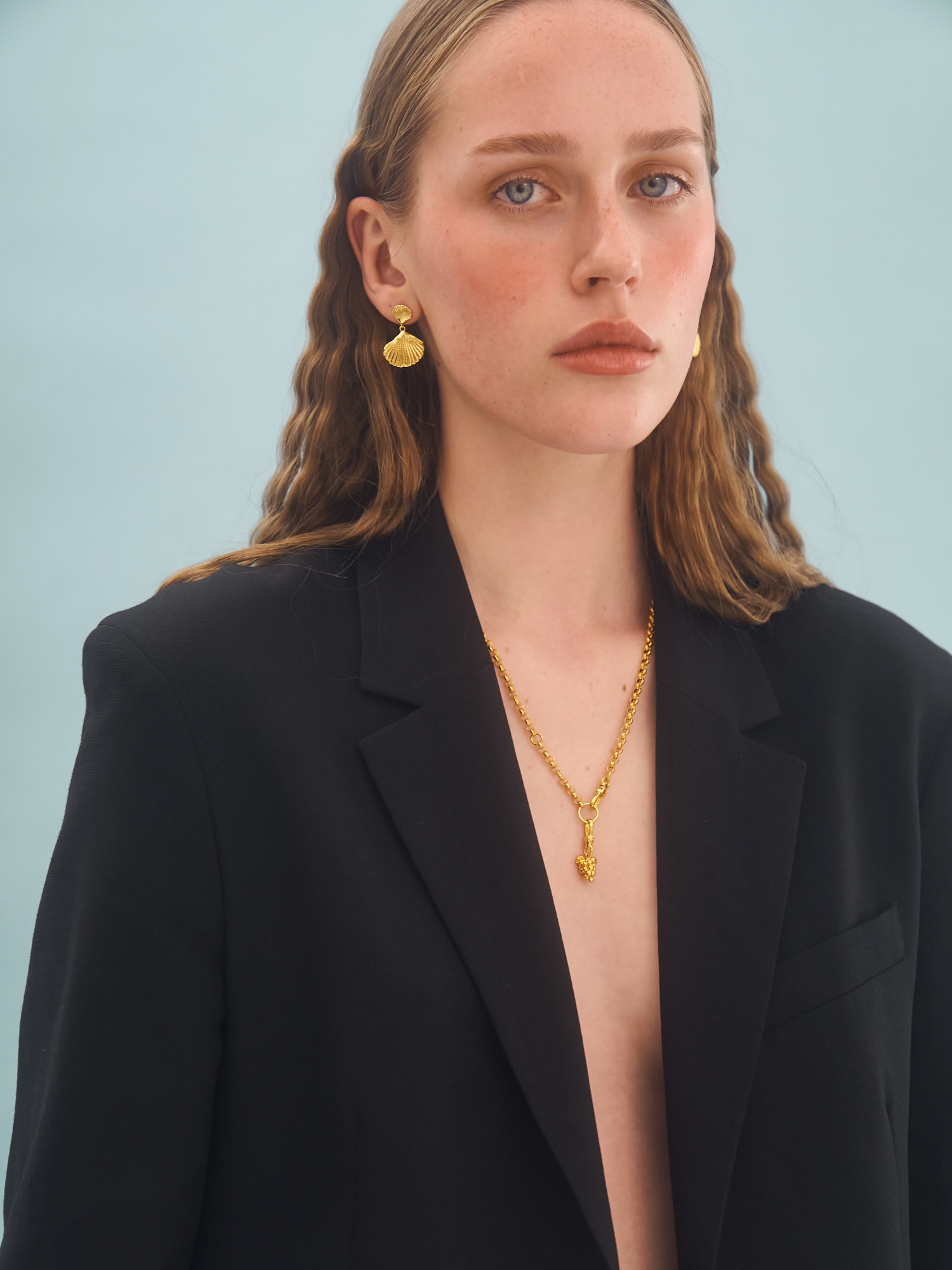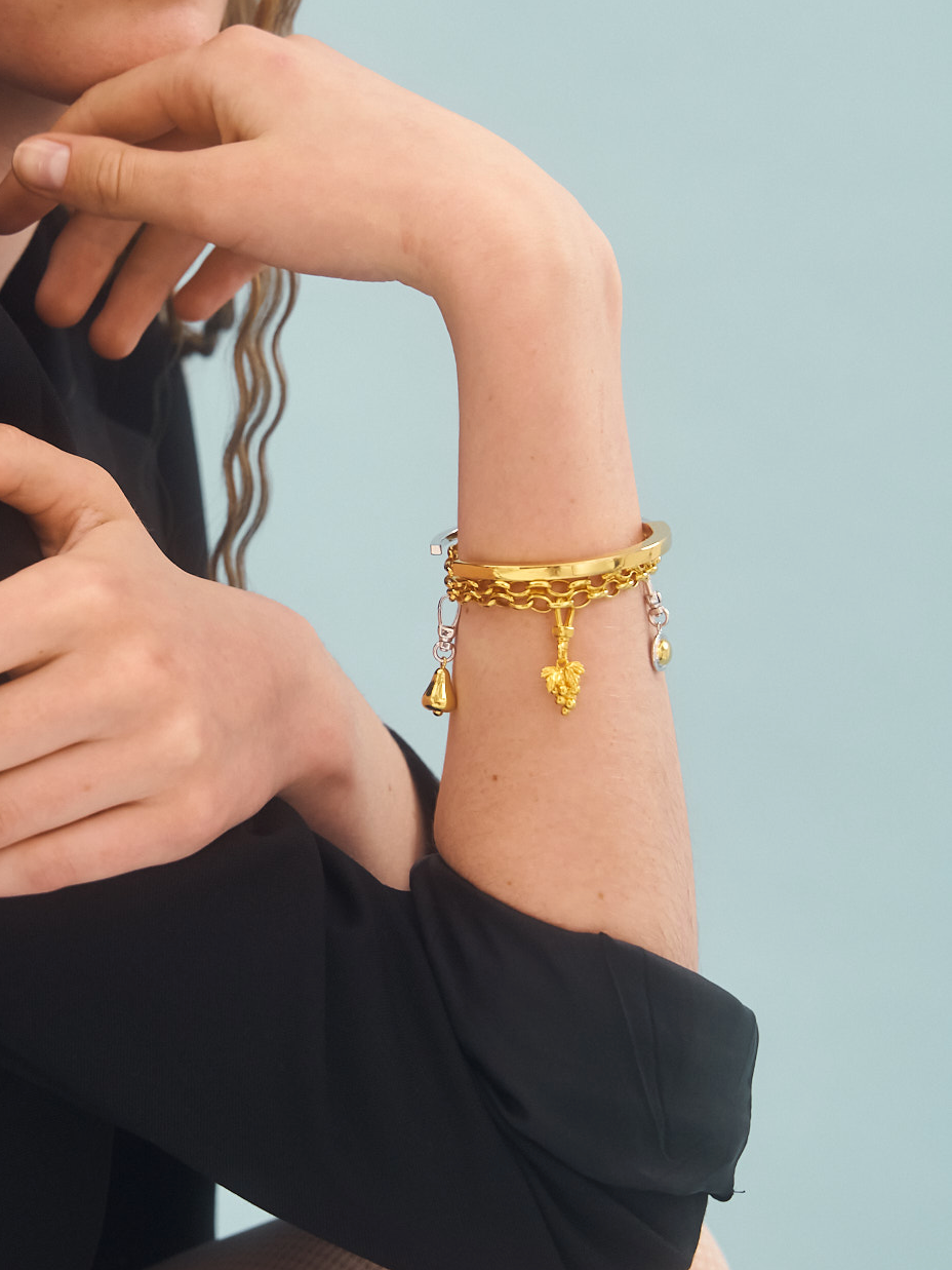 The Vino Pendant draws inspiration from Italy's rich wine culture, capturing the essence of a grape cluster in polished 18k gold plating. This charming piece adds a playful, refined touch to any necklace or bracelet, celebrating Italian heritage and style with elegance and versatility.